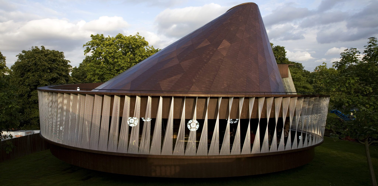 Semblable à un large chapiteau, le bâtiment éphémère en acier offre une illusion de solidité, tandis que les courbes de son toit, évoquant un morceau de papier plié et replié, créent une impression de mouvement, et définissent à l’intérieur de l’édifice plusieurs espaces distincts. Évoluant au fil des mois selon les intempéries, ces derniers créent une impression de mouvement perpétuel… Un contraste esthétique fort face au bâtiment adjacent en pierres de la Serpentine, qui ouvrira la voie à plus de vingt ans de collaborations avec des architectes et artistes de renom, proposant chaque année un nouveau lieu éphémère à l’image de leurs univers singuliers.