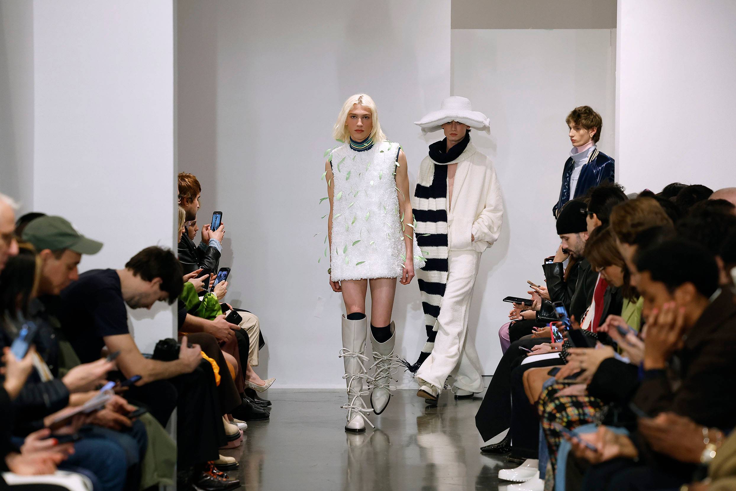La personnalité espiègle de la photographe rayonne aussi dans ses images de mode, comme dans cette photo d’un modèle de Pierre Cardin de 1966. Vêtue des vêtements typiques des ambitions space age des années 60, la mannequin porte des bottes vernies, un manteau trapèze et un chapeau évoquant une soucoupe volante. La photo est prise sur un site de construction, et, derrière la jeune femme blonde et élégante, passe un ouvrier médusé par ce spectacle insolite. Ailleurs, elle saisit, comme dans un dialogue avec Robert Doisneau ou Édouard Boubat (ou avec les “petits métiers” d’Irving Penn), un charbonnier surnommé “Mimile”, couvert de suie mais souriant – apparition digne d’un film de zombies – ou des bouchers couronnés par les cuisses étrangement sensuelles d’un cochon qu’ils transportent. Les scènes de rue pétillent d’un humour surréaliste et quasi burlesque qui ferait penser à Federico Fellini, si l’on n’y décelait aussi cet art classique de la composition.