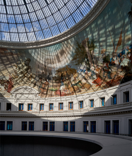 This roundness within the roundness forms the most impressive space at the new Bourse, an atrium sheltered by the 19th century architecture of the building, a peaceful haven with exceptional zenith lighting looking directly over the dome and thus offering a veritably cosmic view of the sky. Between sky and earth, between earthly existence embodied by materiality (the ground is made of concrete) and spiritual aspiration, we can feel the trademark of Tadao Ando, whose masterpieces of abstraction and introspection illuminate the island of Naoshima. The nine meters of height create a scale that suits the works to be displayed here. “The example of the Grand Palais,” explains Martin Bethenod, “has shown us that with a dome 30 meters high, even the most monumental works of Richard Serra will appear to be small. The cylinder here creates a more intimate scale for the oeuvres. But there’s no injunction to monumentality at the Bourse. We have imagined spaces that revolve around the rotunda in very different formats: a 120 m2 space that lends itself to hosting photography and works on paper, spaces of up to 650 m2 with a height of 4 meters, and others that are more monumental and reach up to 8 meters in height.”