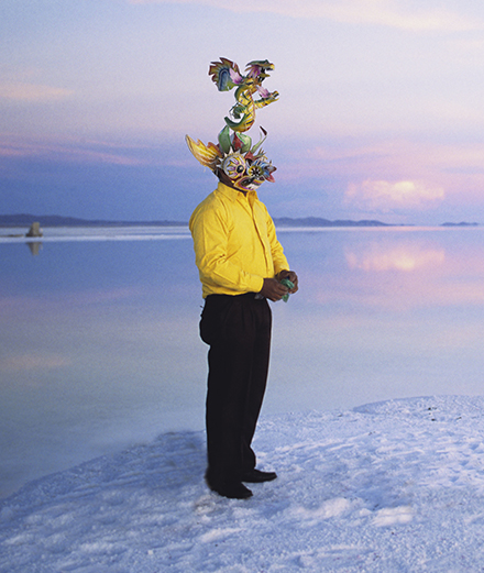 In his own artistic practice, Enrique Ramirez always seeks instability. Instead of the firmness of the earth on which humans have built the foundations of their future for over a thousand years, the artist would rather focus on the sea, which he understands as “a real material and support to understand the world”. On twelve cubic television sets, spread out like blocks at the back of the main room, one can discover his videos of the ocean shot from the sky. Within these twelve squares, the continuous movement of images overturns the minimal, black, and fixed form of the container. Digital and almost abstract canvases unfold with flow on these screens, as a testimony of the unpredictable power of a planet made up of 70% water, which humans will never be able to completely tame despite their efforts. A few steps away, another striking film projected on a large screen demonstrates the Chilean’s ability to combine politics and poetics. In the Bolivian salt desert, a masked figure covered by a gigantic puddle of water caused by the rain is dragging a bunch of costumes tied to his waist with ropes across the white sand. The devil-like or a dragon- like mask was originally created by the region’s indigenous people to frighten the Spanish conquistadors. It now becomes the prop of a colorful yet strange carnival, joined by a brass band of local musicians. While the actors in the video are advocating for the indestructible link uniting them to their land by the simple act of walking, this procession facing the horizon and heading towards the right-hand side of the frame is also a rite of passage to the afterlife.