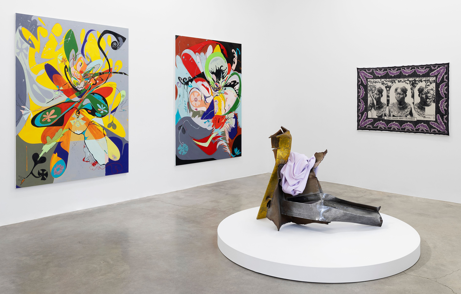 As a direct counterpart to Chromati’s paintings, Kennedy Yanko’s sculpture stands at the center of the first room, atop a circular pedestal. Here too, the female body is distilled to its essence—specifically its posture—through the tension and reliefs within this assemblage of industrial materials, which occasionally hint at a seated silhouette. One of the few sculptors in the selection, the American artist showcases her unique visual language, recalling both the New Realists—César, Arman—and the extruded volumes of Anita Molinero.