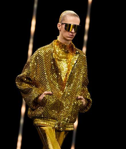 With its flamboyant pieces, the collection gives space to sequins, which adorn transparent tank tops, oversized bombers, and a pair of leggings for men. One studded leather jacket, then another one ornamented with drawings appear in a wide range of cuts and colours, while large jeans pair with Rockstar-like silver or gold leather pants. Some pieces feature sensational feathers or sparkling faux furs and others disclose glitzy retro-futuristic rock boots.