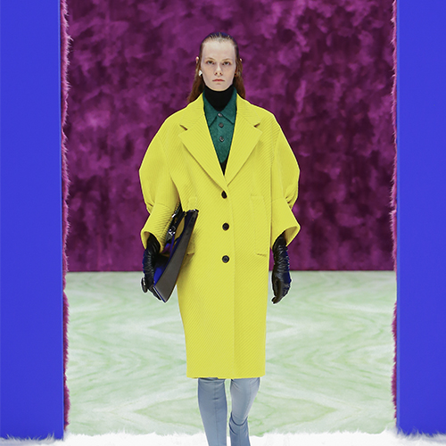 Prada’s new adventure since the arrival of Raf Simons as co-artistic director is a story with several chapters. Evidencing this, the second women’s ready-to-wear collection created by the Belgian designer with Miuccia Prada is a continuation of their men’s collection, unveiled last January. It took place in the same decor featured in the earlier show, designed by the famous Dutch architect Rem Koolhaas and his agency AMO, which creates a pathway between circular and square rooms with walls and floors in marble, plaster, but also resin and faux fur coloured in hues of red, purple, pink, blue or green, creating an all-enveloping cocoon-like environment. Then there’s clothing: this time with feminine silhouettes, Raf Simons and Miuccia Prada once again offer thick coats with six silver buttons and triangular necklines, long-sleeved tops and tight-fitting suits covered with colourful and graphic motifs reminiscent of the house’s history while the XXL bombers and gloves with zip pockets on the back of the hand are also reminiscent of those sported by the male models a month ago.