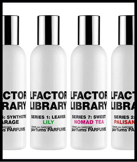 “Olfactory Library, Eau de Cologne, Calamus, Lily, Palisander, Sequoia, Garage, Soda, Tar, Nomad Tea and Stickycake”, Eau de Toilette, COMME DES GARÇONS. 80 euros, 100 ml.