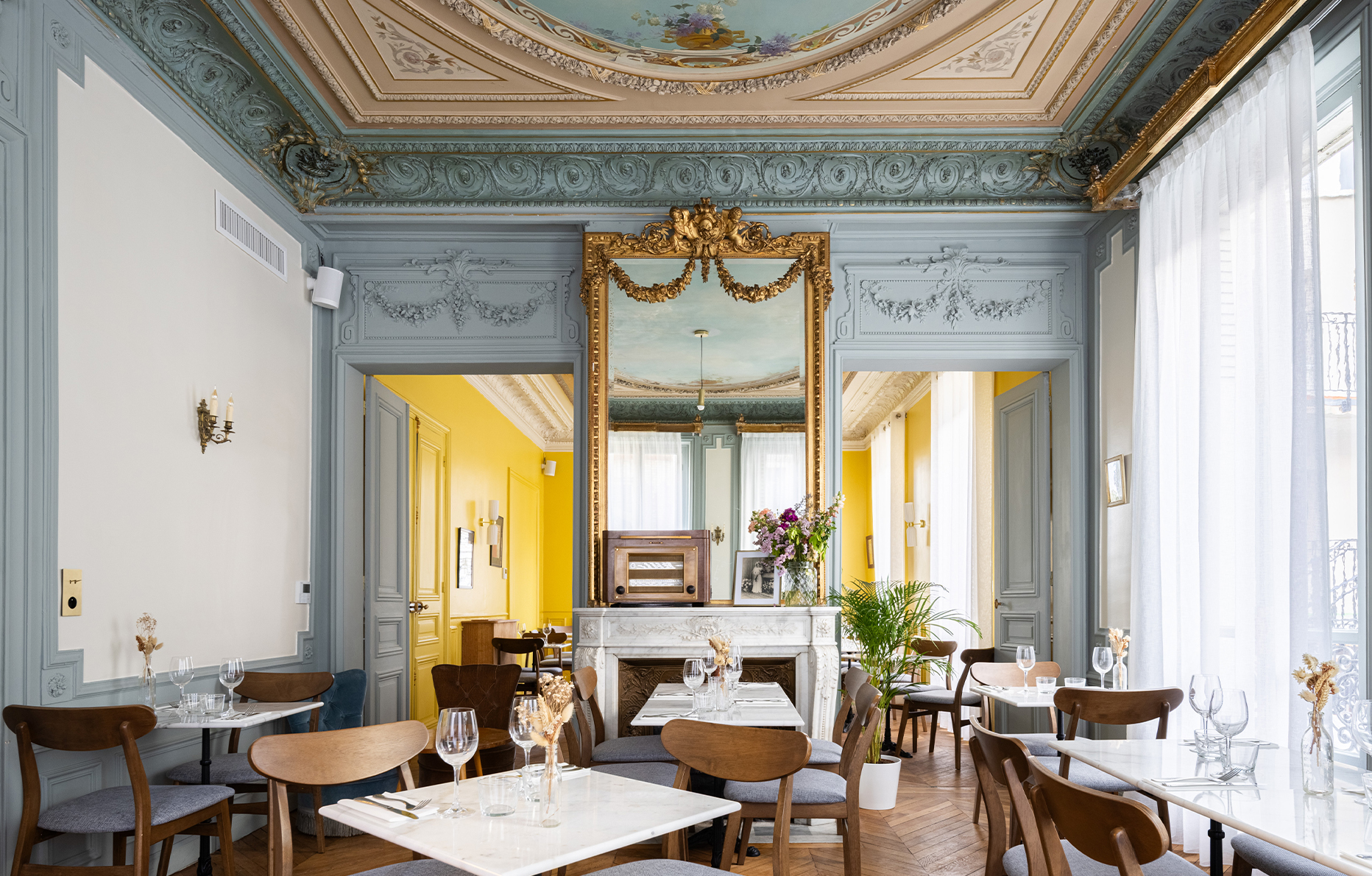 Un projet familial dont la passion et la personnalité des hôtes se retrouvent dans l’acceuil chaleureux réservé aux clients de l’hôtel. Comme à ceux du restaurant, dirigé par le chef Romain Van de Veire et son équipe, ouvert à tous. Conservant les décors d’origine de la bâtisse, les salles et les chambres mélangent avec brio l’ancien et le moderne. Le papier peint fleuri de l’ancien bureau épouse parfaitement le nouveau bar-réception. Tandis que les moulures et les peintures du plafond complètent somptueusement les murs repeints en bleu ciel et en jaune des salons du restaurant…