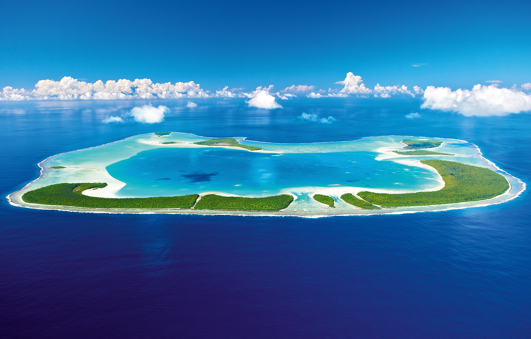 Le transfert de Papeete en avion privé affrété par l’hôtel annonce déjà la couleur. Perle immaculée du Pacifique, l’atoll de Teti’aroa s’étend sous les yeux ébahis du voyageur sur l’immensité azur. Treize motus (“îlots”) tapissés d’une luxuriante cocoteraie vert émeraude couronnent le lagon aux eaux d’une transparence irréelle, constellées de massifs coralliens aux mille nuances. À travers le hublot, on aperçoit une baleine évoluant à quelques brassées du récif. Clairement, nous sommes aux portes du paradis.