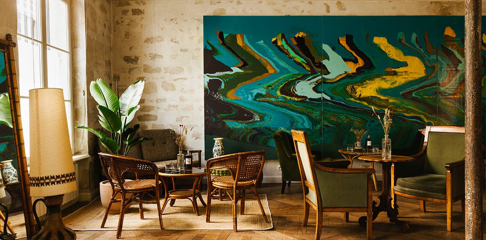 Armée de beaucoup de passion et d’une bonne dose d’audace, la fondatrice du rhum Eminente, Camille de Dominicis et la curatrice havanaise Laura Salas Redondo ont conçu ce lieu en s’inspirant des emblématiques paladares (restaurant familiaux) qui peuplent les rues de Cuba. Et c’est à s’y tromper : la décoration, qui mêle meubles vintage en rotin et velours vert, et œuvres d’art colorées d’une dizaine d’artistes cubains, transporte ses invités du Marais parisien sur l’île antillaise en un clin d’œil.