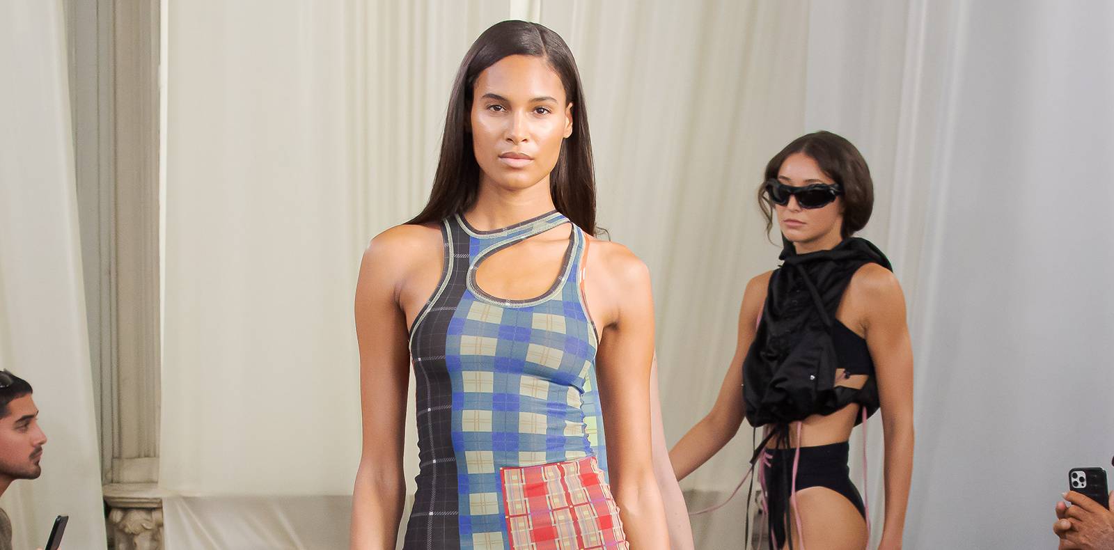 Robe-pull déstructurée, caleçon ultra moulant, micro-jupe et maillot de bain, tongs-cuissardes (vous avez bien lu), top transparent et veste blazer qui semble déchiré. “Mon corps est en transit, intimement vêtu de la fête d’hier et des nouveaux commencements de demain ; jamais trop tôt ni trop tard. Des salles de réunion chromées aux plages isolées, je suis intemporelle et au-delà du temps” lit le communiqué de presse transmis par la marque.