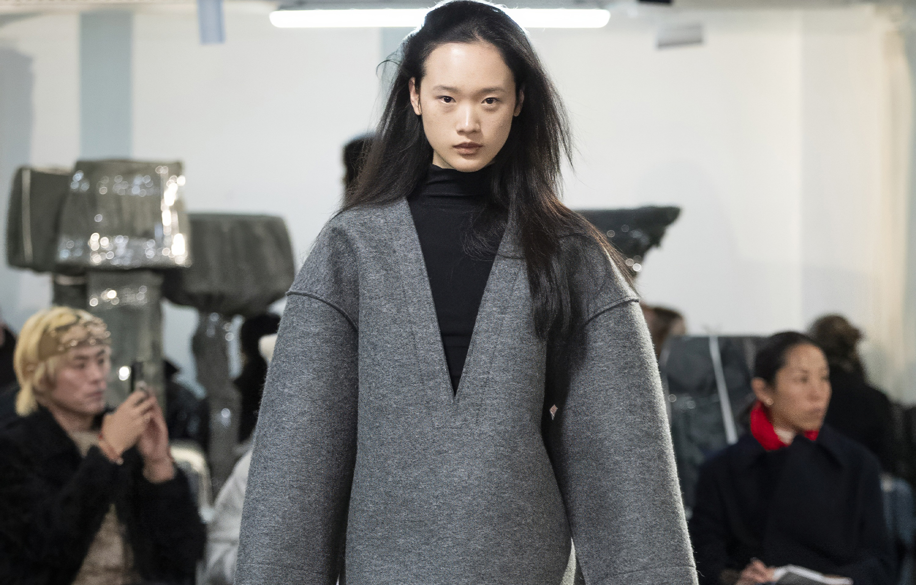 Organisé au sein de la galerie Paradis, le show se déploie autour d’invités installés sur des chaises et sur des fauteuils de designers (dont certains pouvaient même être achetés, leur prix figurant sur une étiquette). Un décor qui répond justement à la vision de la mode de Marie Adam-Leenaerdt : “Ce que j’aime dans ce lieu, c’est la temporalité qu’il invoque. On est dans une galerie de mobilier, où le rythme est long.”