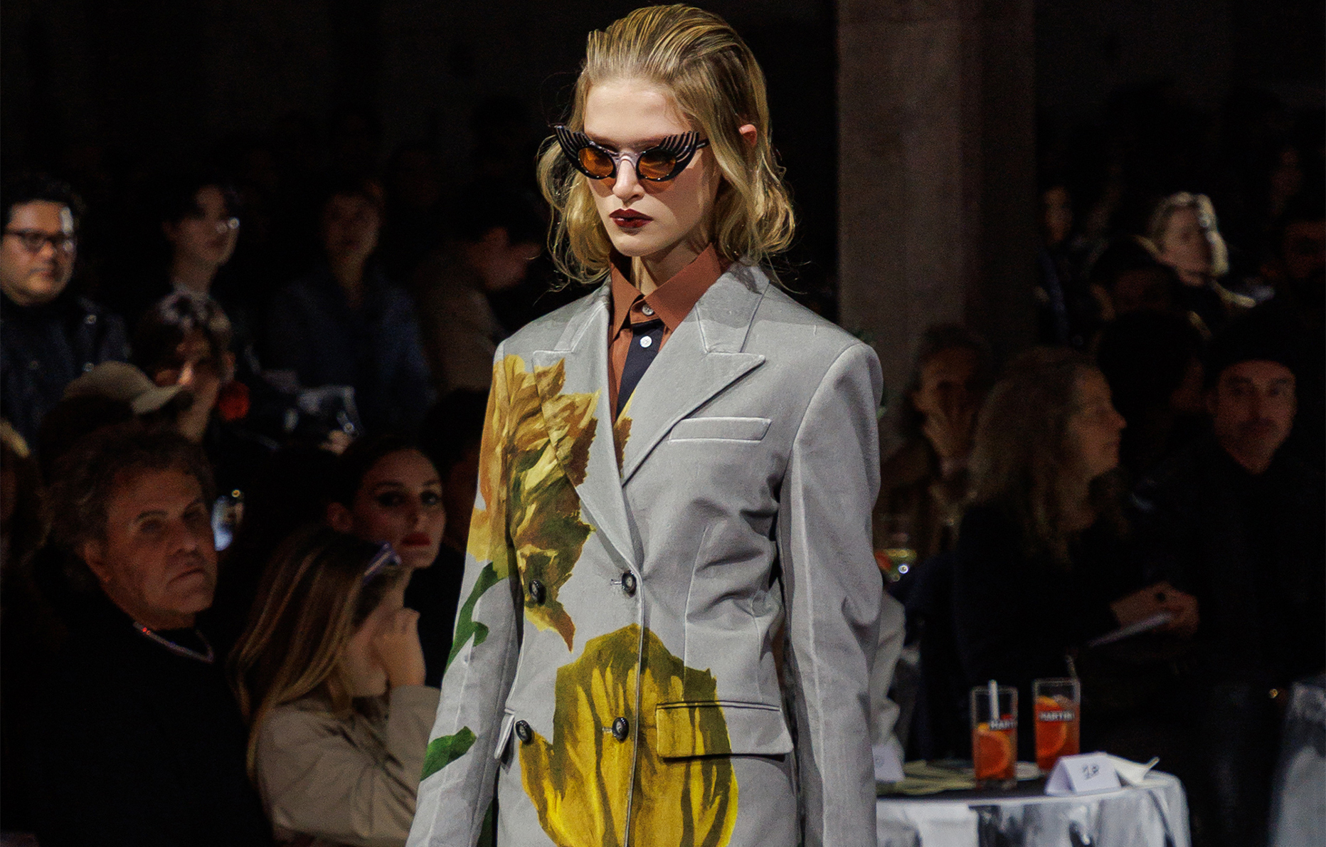 Leurs inspirations et leur parcours alimentent alors une discussion passionnée. Et qui donne naissance à une résidence artistique d’un mois à Londres, au cours de laquelle ils imaginent ensemble les silhouettes de la prochaine collection Marni automne-hiver 2025-2026. Un contexte fascinant et exaltant, auquel le créateur italien rend aujourd’hui hommage. Il installe ses invités autour de petites tables recouvertes de nappes peintes – et sur lesquelles sont servis, avant le défilé, des verres de Martini vermouth.
