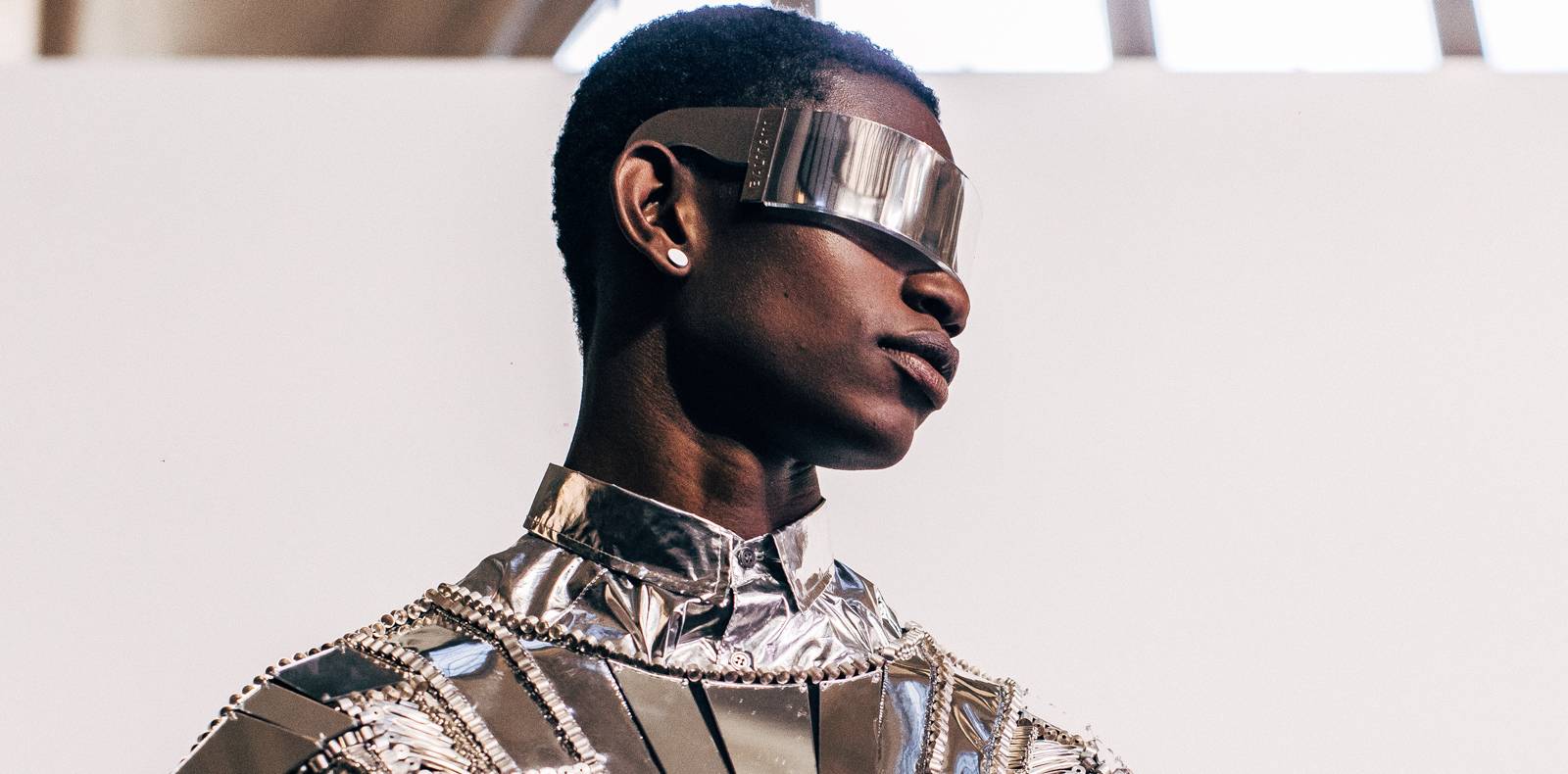 Ainsi retrouve-t-on notamment imprimés sur certaines pièces des casques de moto imaginés par l’artiste portugais Tiago Alexandre spécialement pour le défilé MSGM, ou encore des photographies du métro milanais capturées par une intelligence artificielle en collaboration avec Google Pixel 8, reprises sur des chemises ou des pulls.