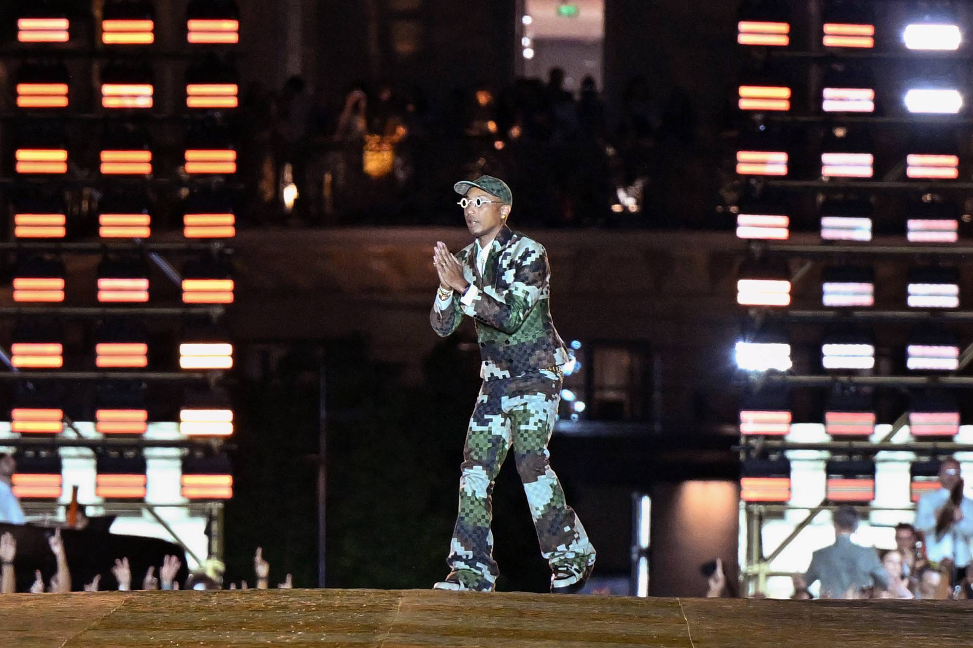 Un coup de communication magistral qui n’a pas manqué de ravir le groupe LVMH, rassuré d’avoir misé sur Pharrell pour redorer l’image de Louis Vuitton, suite au départ du regretté Virgil Abloh en 2021. En coulisses de ce défilé monumental (présenté juste en face du siège de la célèbre maison française), Bernard Arnault confie avoir “adoré” les silhouettes de neodandy imaginées par le créateur américain, ainsi que la réinterprétation du motif damier en version “camo”, fil conducteur d’une collection que l’on pourrait presque déjà qualifier d’historique.